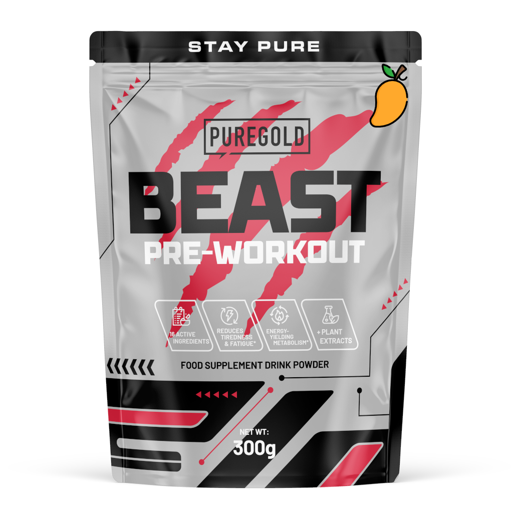 Beast Pre-Workout — 300 g me aromë mangoje. Një pije energjike para stërvitjes që ndihmon në përmirësimin e përqendrimit dhe përgatitjen e trupit për sforcim fizik. Formula kombinon L-argininën dhe L-citruline malate për të përmirësuar qarkullimin e gjakut, beta-alaninën për të mbështetur muskujt gjatë ushtrimeve, tirozinën dhe kafeinën për përqendrim mendor, si dhe përbërës të tjerë – taurinë, L-karnitinë, glutaminë dhe izomaltuloze. Ekstrakte bimore të shtuara (çaj jeshil, kafe jeshile, garcinia, piper i zi) dhe elementë gjurmë (B6 dhe zink). Pija është freskuese, e lehtë për t’u përzier, pa konservues dhe pa aspartam