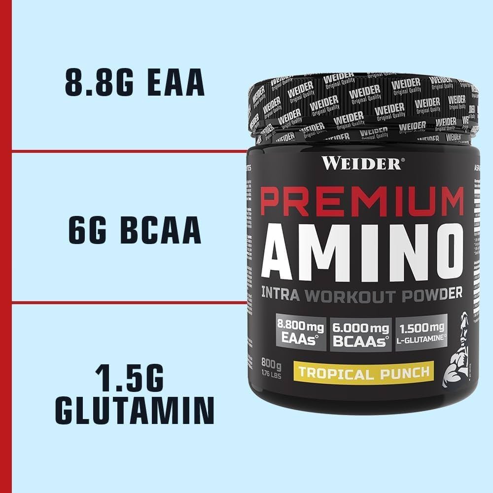 Pluhuri Weider Premium Amino Intra Workout është një suplement i projektuar për t’u konsumuar gjatë seancave intensive stërvitore për të furnizuar muskujt dhe për të mbështetur performancën. Ai ofron një kombinim të aminoacideve esenciale (EAA), karbohidrateve që përthithen shpejt dhe elektroliteve për të ndihmuar në ruajtjen e qëndrueshmërisë, hidratimit dhe shëndetit të muskujve.